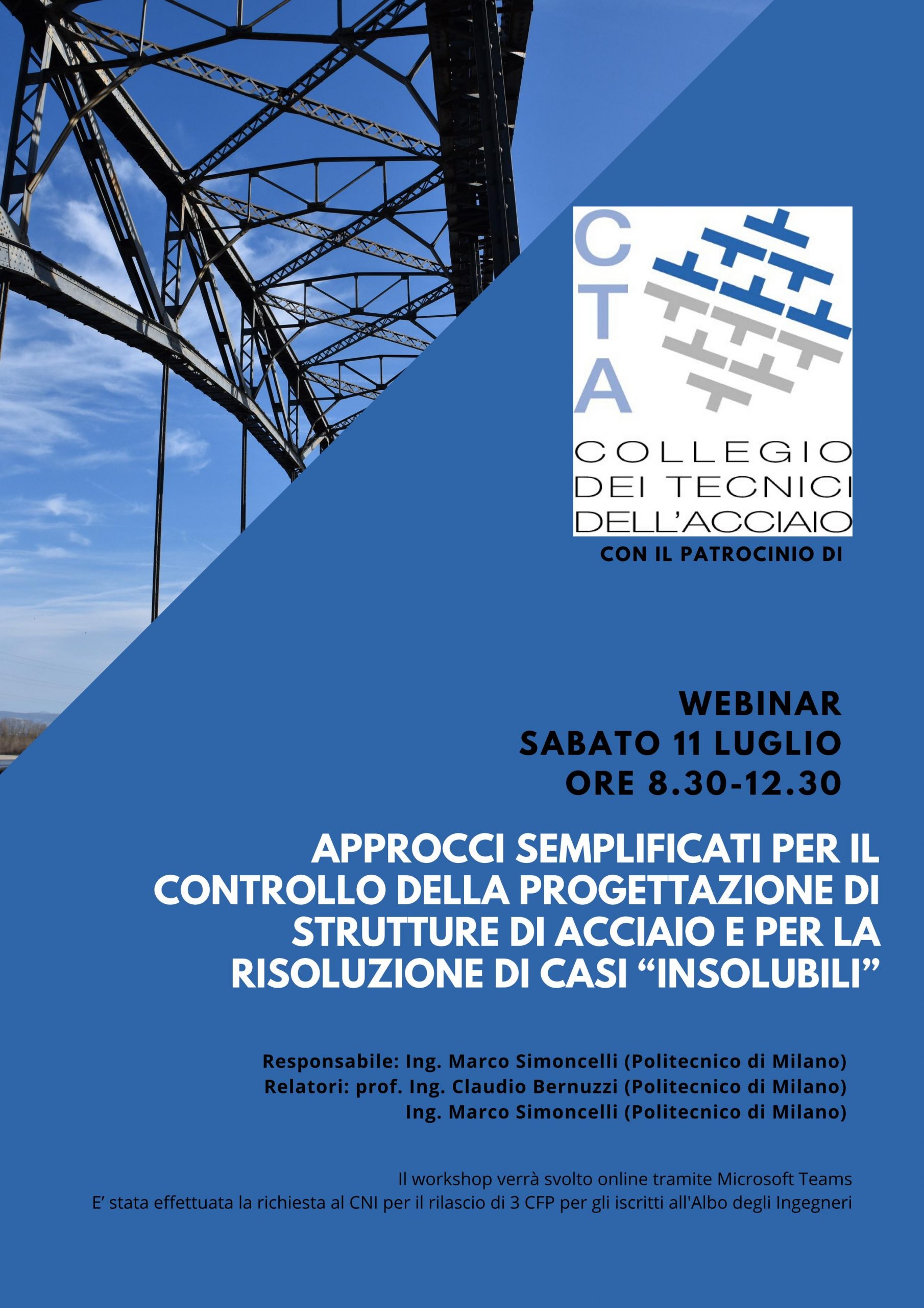 11 LUGLIO 2020 WEBINAR ONLINE: APPROCCI SEMPLIFICATI PER IL CONTROLLO DELLA PROGETTAZIONE DI STRUTTURE DI ACCIAIO E PER LA RISOLUZIONE DI CASI “INSOLUBILI”