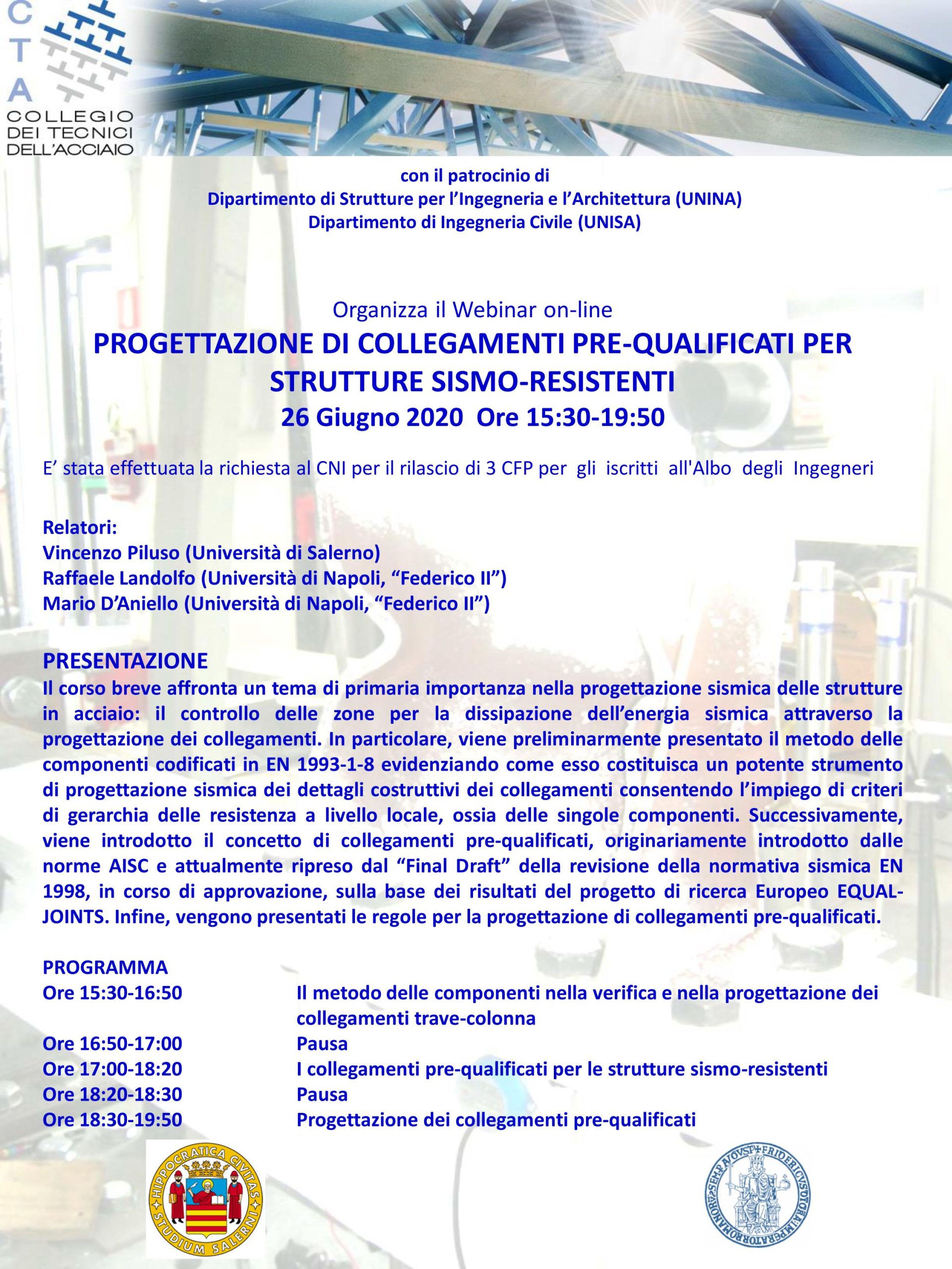 26 GIUGNO 2020 WEBINAR ONLINE: PROGETTAZIONE DI COLLEGAMENTI PRE-QUALIFICATI PER STRUTTURE SISMO-RESISTENTI