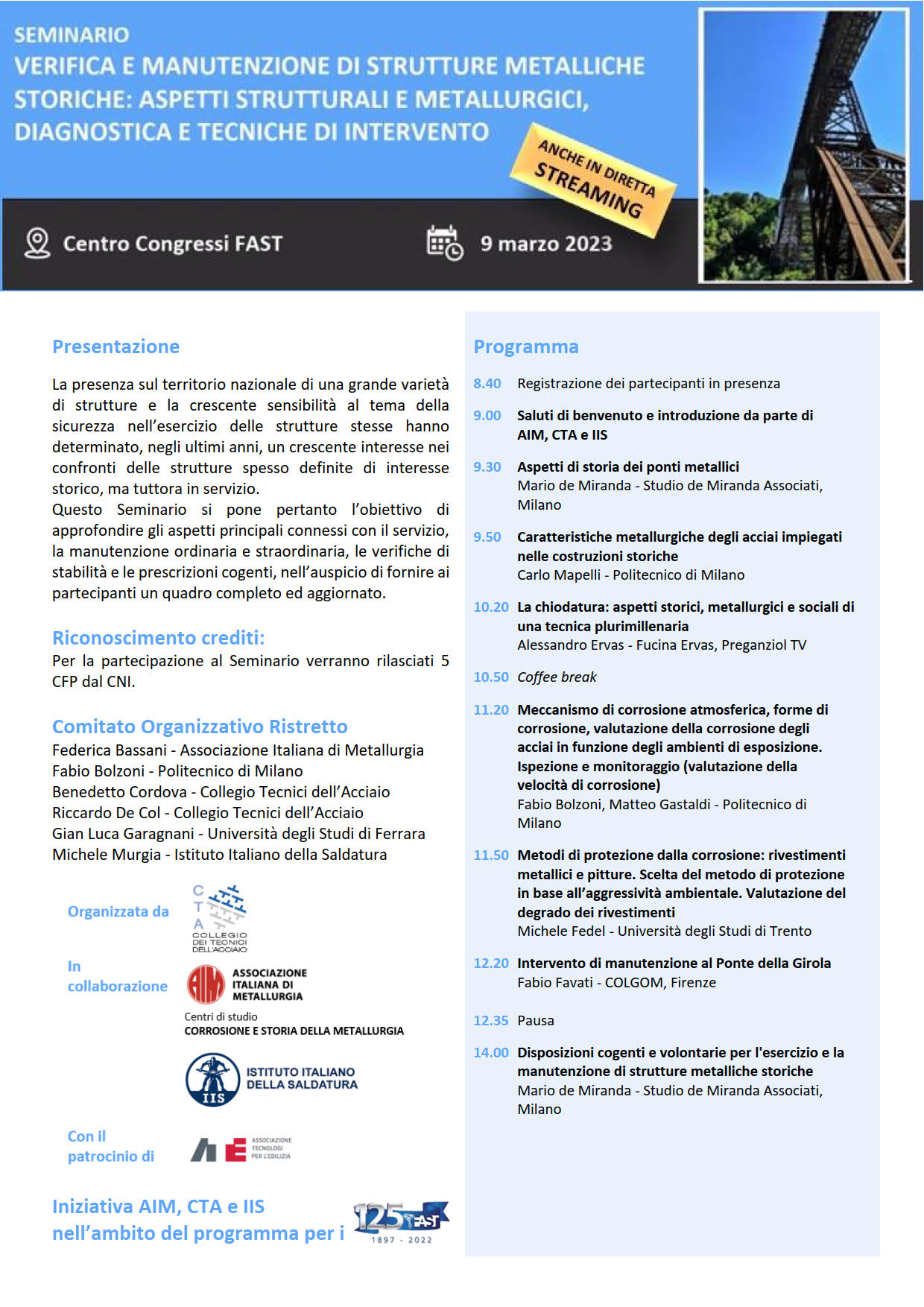 9 MARZO 2023 – GIORNATA DI STUDIO: VERIFICA E MANUTENZIONE DI STRUTTURE METALLICHE STORICHE – ASPETTI STRUTTURALI E METALLURGICI, DIAGNOSTICA E TECNICHE DI INTERVENTO