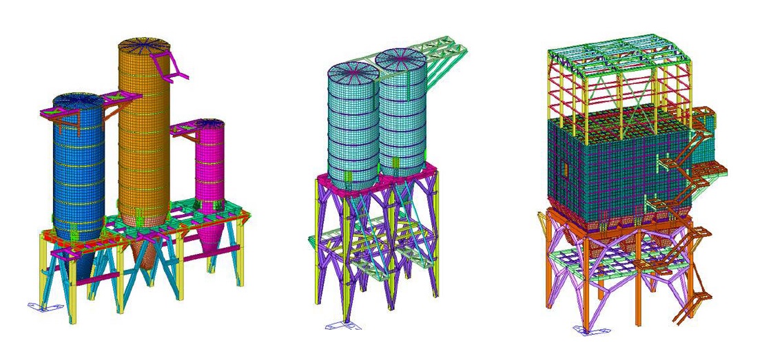 Per le diverse sezioni dell’impianto sono stati sviluppati modelli numerici (modelli agli elementi finiti) separati in relazione alla presenza di giunti tessili e/o di dilatazione che hanno permesso di individuare parti strutturalmente separate dell’impianto nel suo insieme. Si sono effettuate l’analisi statica, l’analisi dinamica modale lineare con spettro di risposta e l’analisi in temperatura. Nelle figure 1-6 sono illustrati alcuni dei diversi impianti analizzati.[…]