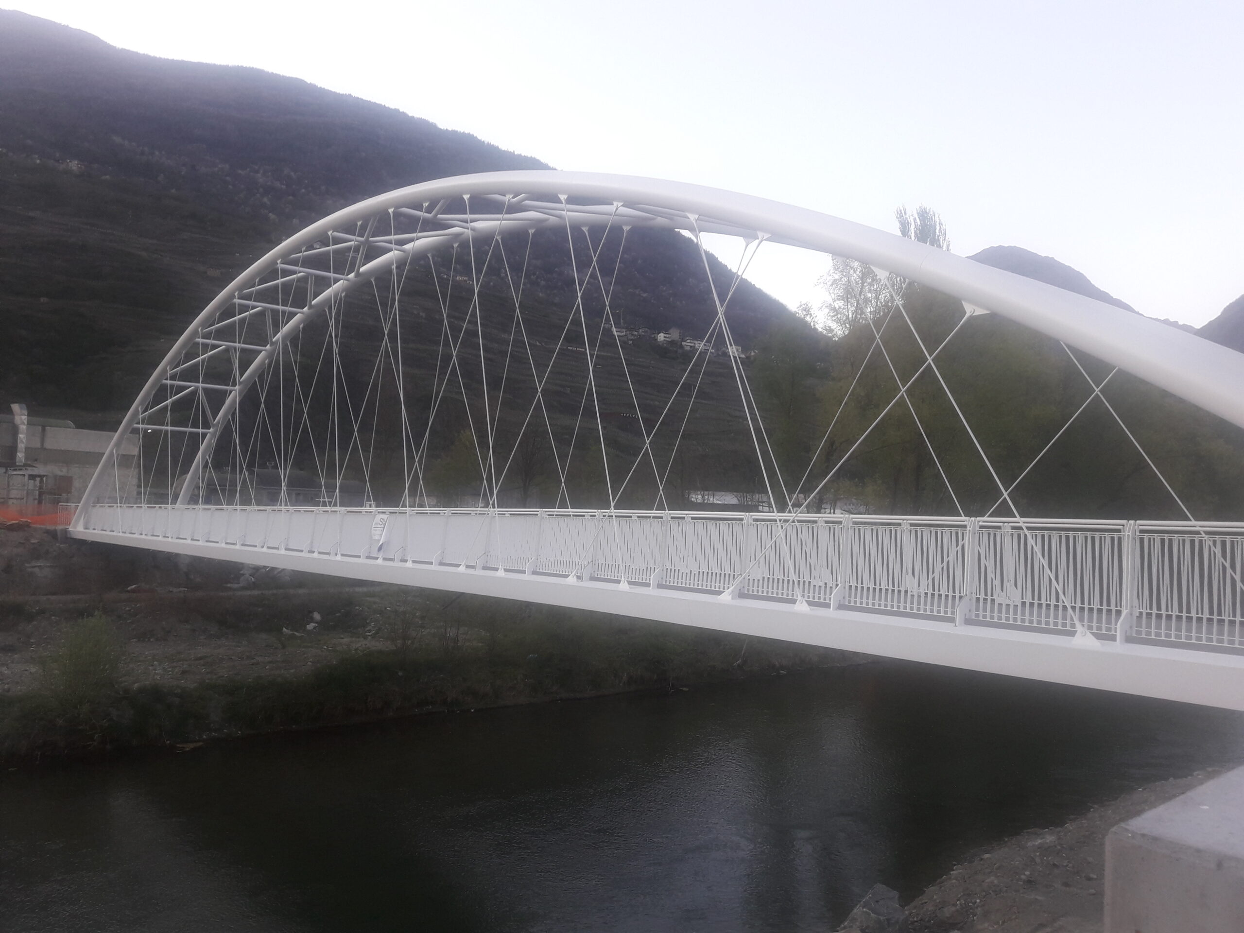 La luce di attraversamento è stata fissata in 63 m per posizionare le spalle completamente al di fuori della sezione dell’alveo. La scelta della tipologia strutturale è caduta sulla soluzione ad arco a via inferiore che ben si adattava alla realizzazione di un collegamento totalmente in piano tra le due sponde e con un impalcato di spessore contenuto (50 cm) per il rispetto del franco idraulico. Tale scelta si prestava ad una realizzazione fuori alveo e ad un successivo varo con autogru. A tale scopo risultava importante contenere il peso della struttura metallica in condizioni di varo.[…]