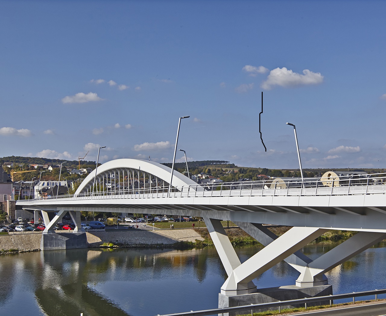 1955. Era un’opera funzionale che era stata realizzata sotto vincoli di budget e tempo lasciando da parte l’estetica. L’amministrazione dei “Ponts et Chaussées” aveva osservato, durante una campagna di controllo dei cavi post-compressi della struttura esistente, che le iniezioni di malta cementizia erano in gran parte carenti e quindi che la protezione dalla corrosione non era più garantita. In effetti molti cavi non erano più tesi, probabilmente a causa della corrosione. Dal 2002, la manutenzione preventiva e una riduzione del traffico avevano permesso di mantenere temporaneamente il ponte in servizio fino alla sua sostituzione definitiva. La struttura scelta per la nuova struttura è quella di un ponte a 4 campate, di cui la campata principale che attraversa la Mosella è ad arco.La scelta di utilizzare l’acciaio è dovuta alla necessità di ridurre al minimo la durata dei lavori è all’imposizione di allargare la via fluviale navigabile. In effetti, prevedendo una futura riqualificazione della chiusa di Grevenmacher come parte del progetto “Grand Canal Rhône Moselle” (Grande Canale Rodano-Mosella) tra Mulhouse e la Saôna, era necessario rimuovere la pila centrale che avrebbe ostacolato la futura navigazione delle imbarcazioni in approccio o in uscita dalla chiusa. Inoltre bisognava garantire un’altezza libera di navigazione di 7,50 m rispetto al livello 133,47 m s.l.m. (livello più alto delle acque navigabile). La chiusura al traffico della strada è durata soltanto quattro mesi e mezzo. La chiusura della via navigabile è durata soltanto una settimana.[…]