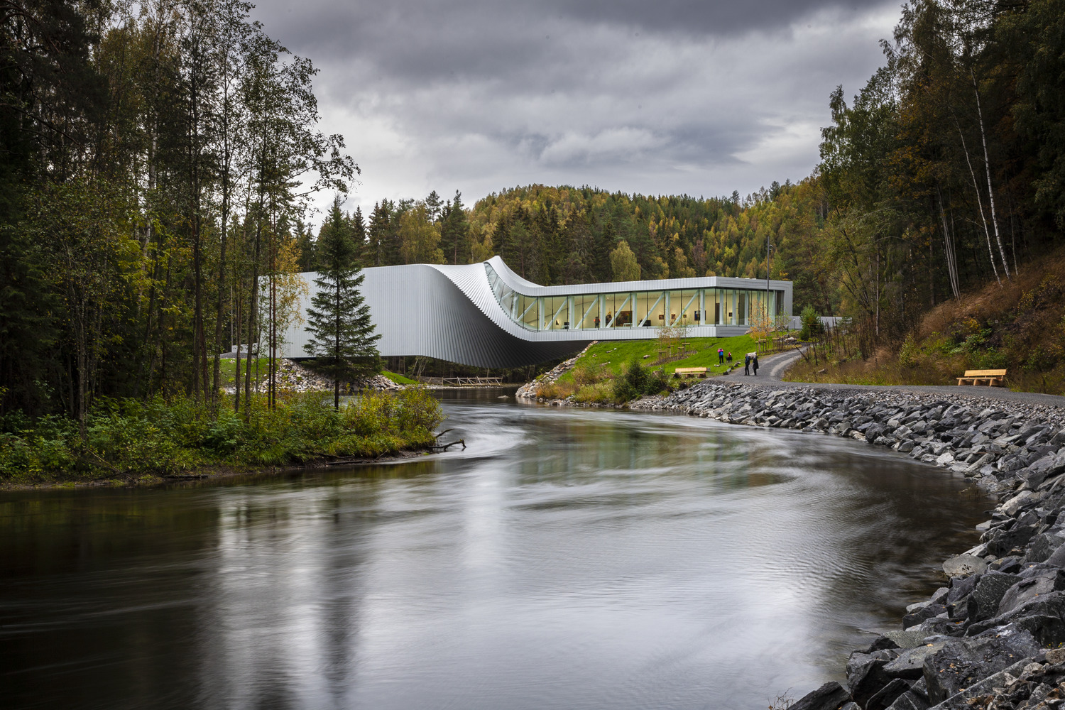 Il nuovo museo di circa 1.000 metri quadrati complessivi si estende per 60 metri attraverso il fiume, configurandosi come una successione di tre spazi espositivi, chiamati: Closed Gallery, Twist Gallery e Panorama Gallery. Accedendo dall’ingresso a sud, i visitatori entrano nello spazio a doppia altezza della Closed Gallery, una galleria priva di luce diurna ma con visuali chiare sull’intero edificio fino all’ingresso nord (figura 4). La Twist Gallery costituisce la parte centrale dell’edificio dove, grazie alla torsione del volume, i soffitti diventano pareti e le pareti si trasformano in soffitti, mettendo in connessione i due spazi espositivi adiacenti. All’estremità nord dell’edificio, si trova invece la Panorama Gallery, contraddistinta da ampie superfici trasparenti che offrono una vista sul fiume e sul paesaggio, mettendo in stretta relazione il visitatore alla natura circostante (figura 5).[…]
