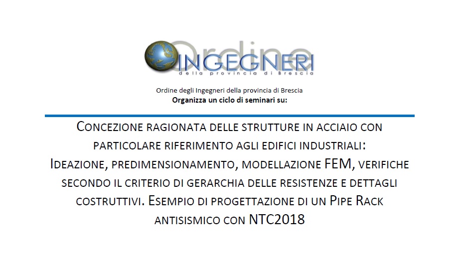 WEBINAR: “CONCEZIONE RAGIONATA DELLE STRUTTURE IN ACCIAIO CON PARTICOLARE RIFERIMENTO AGLI EDIFICI INDUSTRIALI: IDEAZIONE, PREDIMENSIONAMENTO, MODELLAZIONE FEM, VERIFICHE SECONDO IL CRITERIO DI GERARCHIA DELLE RESISTENZE E DETTAGLI COSTRUTTIVI. ESEMPIO DI PROGETTAZIONE DI UN PIPE RACK ANTISISMICO CON NTC2018” (Ordine Ingegneri Brescia)