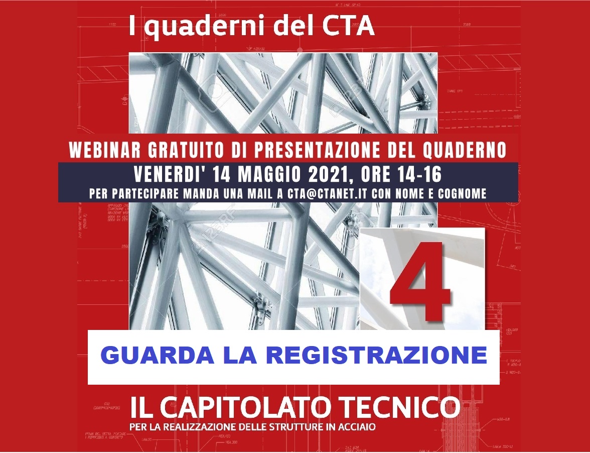 Webinar di presentazione del QUADERNO CTA N. 4 “IL CAPITOLATO TECNICO PER LA REALIZZAZIONE DELLE STRUTTURE IN ACCIAIO” – GUARDA LA REGISTRAZIONE!
